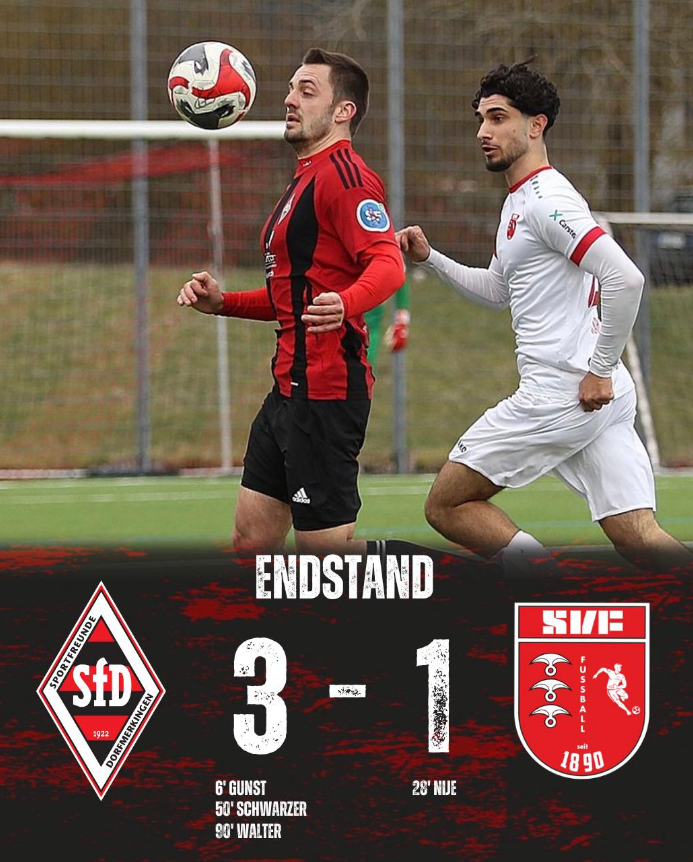 Zum 24. Spieltag der Verbandsliga Württemberg gastierte der SV Fellbach auf dem Härtsfeld. Das Spiel musste aufgrund der Platzverhältnisse in der Dorfmerkinger RÖSER-Arena auf den Kunstrasen stattfinden. Dem Zuschauer Zuspruch tat das keinen Abbruch und so starteten die Dorfmerkinger vor toller Kulisse in das Match. Die erste Aktion hatten jedoch gleich die Gäste. Nach einem Querpass von Rechtsaußen kam Fossi am 5er-Eck zum Abschluss, die Abnahme aber zu schwach. Nach sechs Minuten dann die Führung für die Sportfreunde. Nach gutem Pressing eroberten sich die Dorfmerkinger den Ball in der Hälfte der Gegner. Nietzer bekam den Ball am 16er Eck und legte quer auf Gunst der nur noch einschieben musste. Dieser fasst sich beim Jubel ungläubig mit beiden Händen an den Kopf, es war tatsächlich sein erstes Pflichtspieltor für die Sportfreunde nach über 150 Einsätzen. Es entwickelte sich ein Spiel auf Augenhöhe, wobei die Hausherren beinahe mit 2:0 in Führung gingen aber eine Abseitsposition machte den Treffer ungültig. Im Gegenzug wäre fast de Ausgleich gefallen, Zech stand zu weit vor seinem Tor, der Schuss ging aber an die Latte. 15 Minuten waren gespielt und beide Mannschaften erspielten sich immer wieder kleinere Chancen bis in der 28. Minute der Ausgleich fiel. Njie stieg nach einer Ecke am höchsten und köpfte zum 1:1 ein. Die Sportfreunde wollten direkt Antworten doch der Schuss von Nietzer ging knapp links unten vorbei. Bis zur Halbzeit gab es dann keine nennenswerten Aktionen mehr.