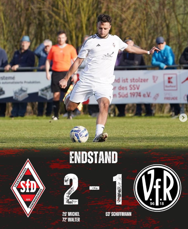 Die zweite Hälfte sollte erst mal so weitergehen wie die erste endete, mit Ausnahme einer Flanke in der 52. Minute auf Rodewald, der sich in aussichtsreicher Position befand aber leider auch knapp im Abseits. In der 72. Minute dann ein Spielzug der Sportfreunde der zum Erfolg führen sollte. Michel flankte den Ball ans 5er-Eck auf Ehrmann, dessen Direktabnahme im Fallen konnte der Keeper noch blocken, doch Walter jagte den Abpraller mit ordentlich Wumms unhaltbar unter die Latte zur 2:0 Führung. Nach mehreren kleine Strafraumaktionen auf beiden Seiten stand es plötzlich 2:1, Schiffmann stand in der 83. Goldrichtig und verkürzte auf ein Tor Abstand. Die Sportfreunde waren jetzt völlig von der Rolle und die Gäste drängten immer wieder in den Strafraum und waren um den Ausgleich bemüht. Mango hätte dann aber in der 92. Minute für die Entscheidung sorgen können. Nach schnellen umschaltspiel stand er völlig allein am 16er, brauchte aber zu lange und die Verteidiger konnten sich wieder stellen und einen Abschluss verhindern. Nach drei weiteren Minuten zittern wurden die SfD-Fans durch den Schlusspfiff erlöst und konnten einen dennoch verdienten Sieg feiern.